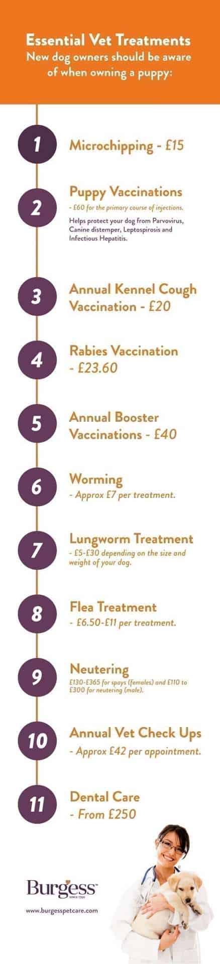 These are the most common healthcare costs, as sourced from Money Supermarket’s guide to average vet bills and information from the Royal Veterinary College on dog vaccines. This list is not exhaustive, and for full details of the health needs of your pet it always best to speak to your vet.