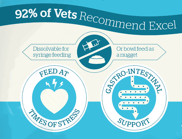 Mix 50gms of Excel DualCare nuggets with sufficient warm water to produce a watery paste that can be passed through a wide tip feeding syringe. We recommend using 2 parts warm water to 1 part Excel DualCare, allowing the nuggets to soak for 3-4 minutes. Alternatively it can be offered in a shallow bowl or spoon for your rabbit or guinea pig to lick and lap. The consistency can be altered to suit the method of feeding and your pet’s preference.